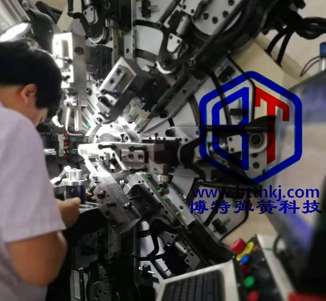 冷成形工艺一次性自动化能力,冷成形弹簧机目前已发展到12爪,在(0.3~14)mm范围内的钢丝,基本上在8爪成形机能一次成形,其工艺范围能力最大规格可达20mm,2000MPa,旋绕比5,但变径或等径料弹簧和偏心弹簧的冷成形工艺还是有局限性,目前成形工艺设备的发展方向: